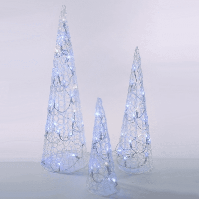 These Clear Cones with Red, Green and Blue LED Light is an elegant addition to any holiday decor! This set of three features different heights from 12-inches to 23.6-inches. Lights wrap around each cone for festive glow.