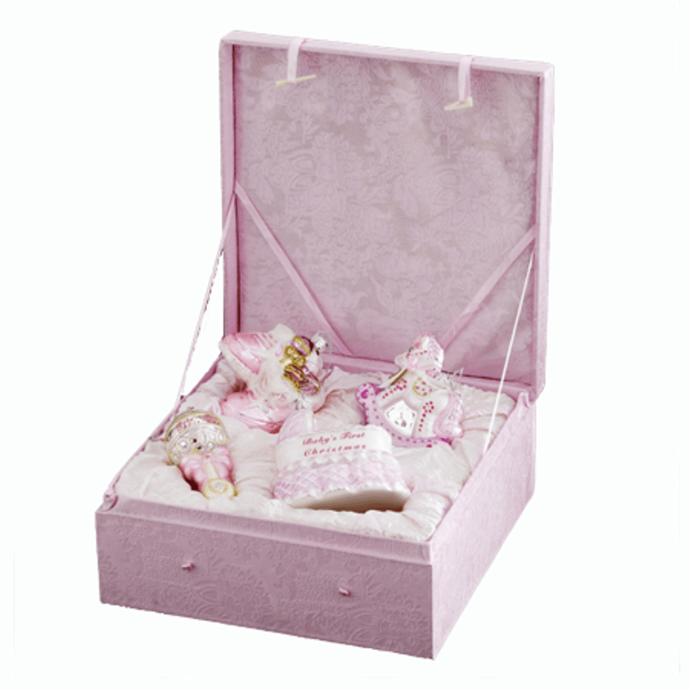 Celebrate your baby girl’s first Christmas with this Noble Gems baby girl ornaments boxed set! These ornaments feature classic baby symbols including a pair of booties, a rocking horse, a rattle, and a bassinet in a delicate pink and white color scheme. Perfect for celebrating your baby girl’s first Christmas.